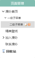子菜单的编辑需要在页面管理工具框内完成。鼠标悬停于页面管理工具框内菜单标题上方,在其右方出现编辑工具。另外,当前页面的右方始终带有编辑工具。