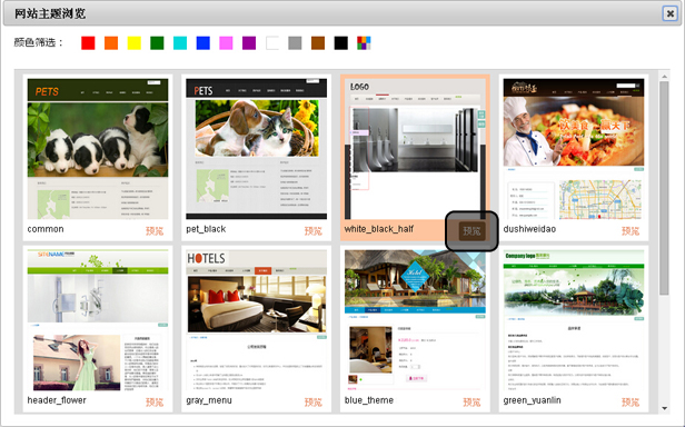 在弹出的主题选择对话框内点击相应主题的"预览"按钮对该主题进行预览。