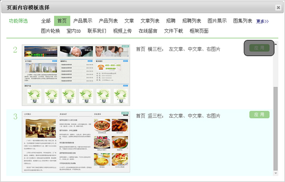 ,即可将模板应用到页面内容区域并退出页面内容模板选择对话框。